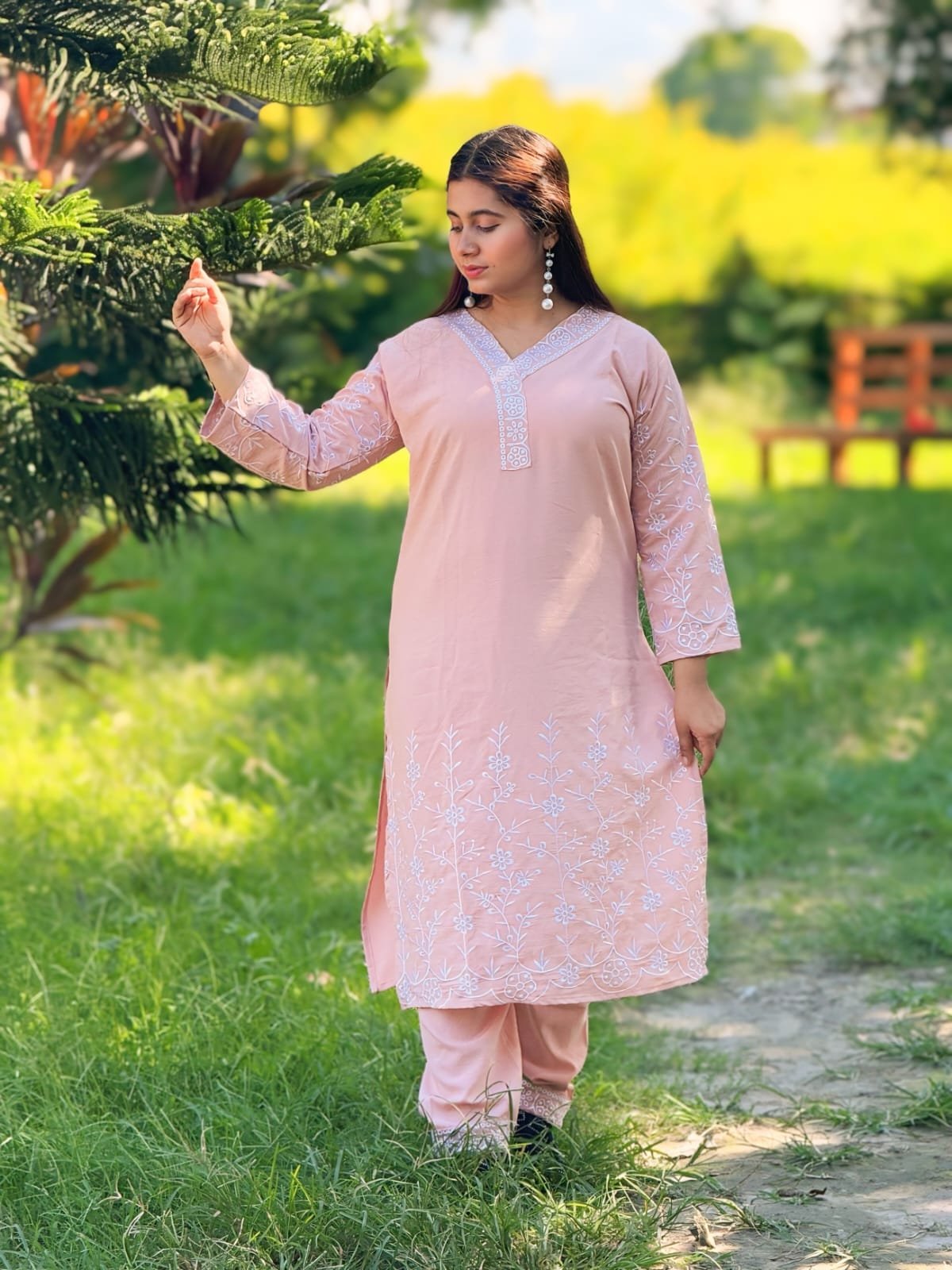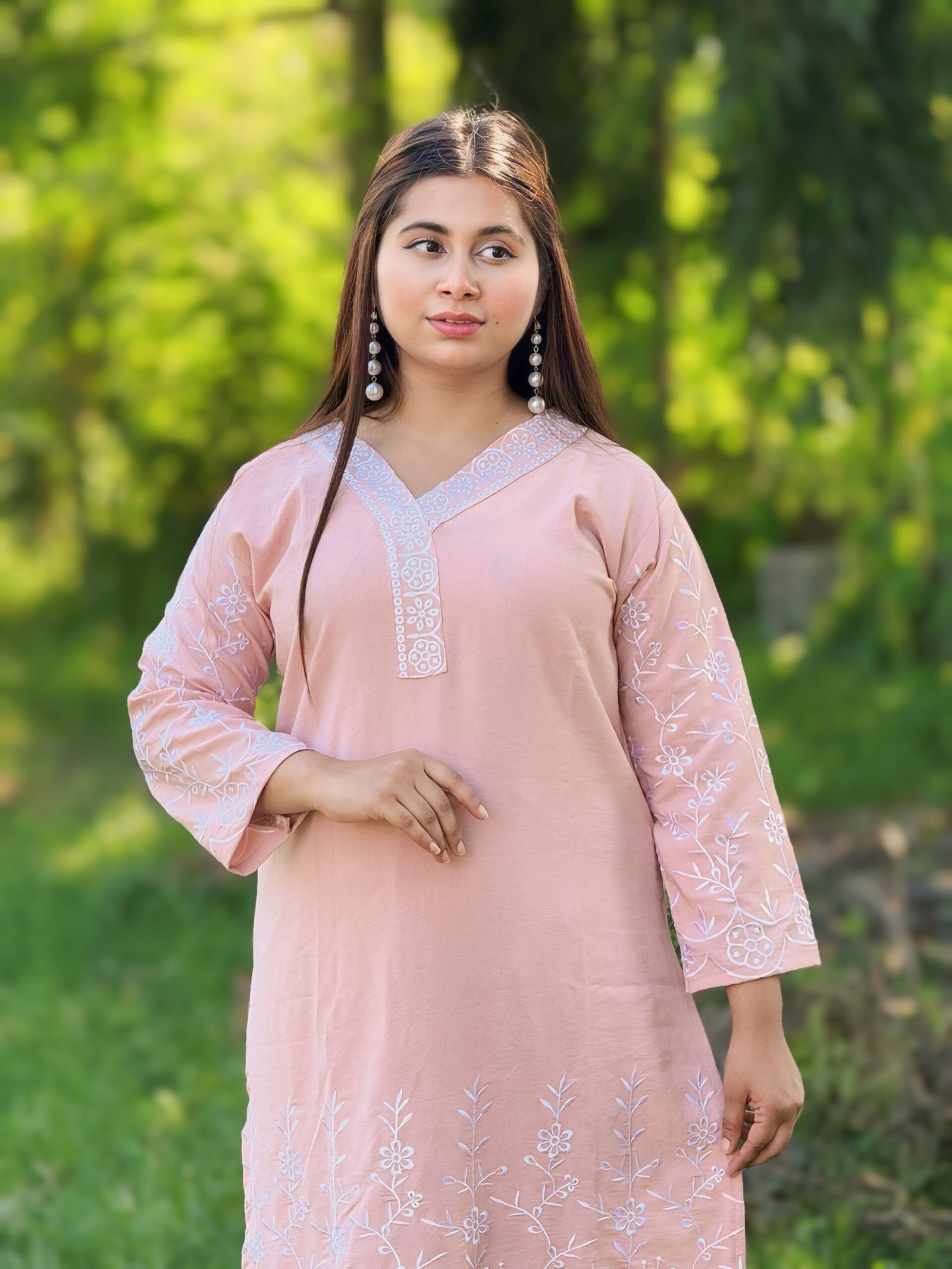 🌸 স্লিভস: থ্রি-কোয়ার্টার হাতা, এমব্রয়ডারি কাজ করা